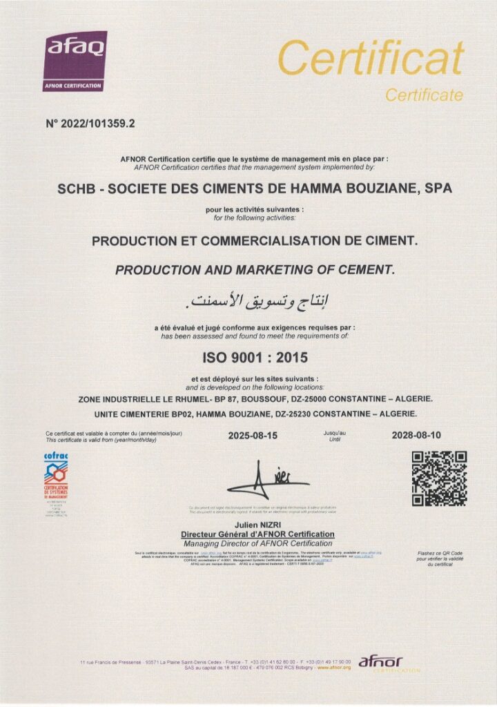 La société des Ciments de Hamma Bouziane SPA, filiale du groupe GICA, informe l’ensemble des soumissionnaires ayant participé à l’appel d’offres National et International ouvert avec exigences d capacités minimales N°02/SCDA/SCHB/2025, relatif