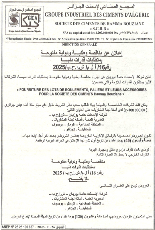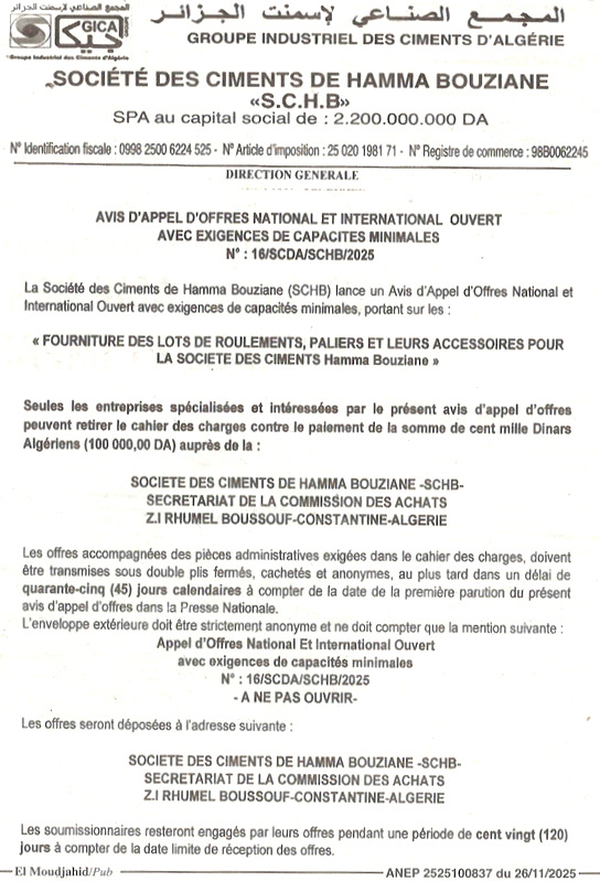 La société des Ciments de Hamma Bouziane -SCHB-, lance un avis d’appel d’offres National et International Ouvert Avec exigences de capacités minimales, portant sur :