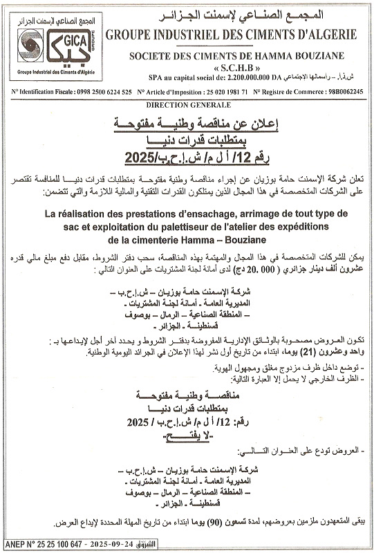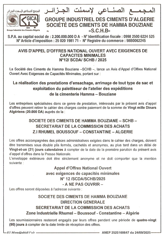 La société des ciments de Hamma Bouziane -SCHB-, lance un avis d’appel d’offres national ouvert avec exigences de capacité minimales, portant sur :