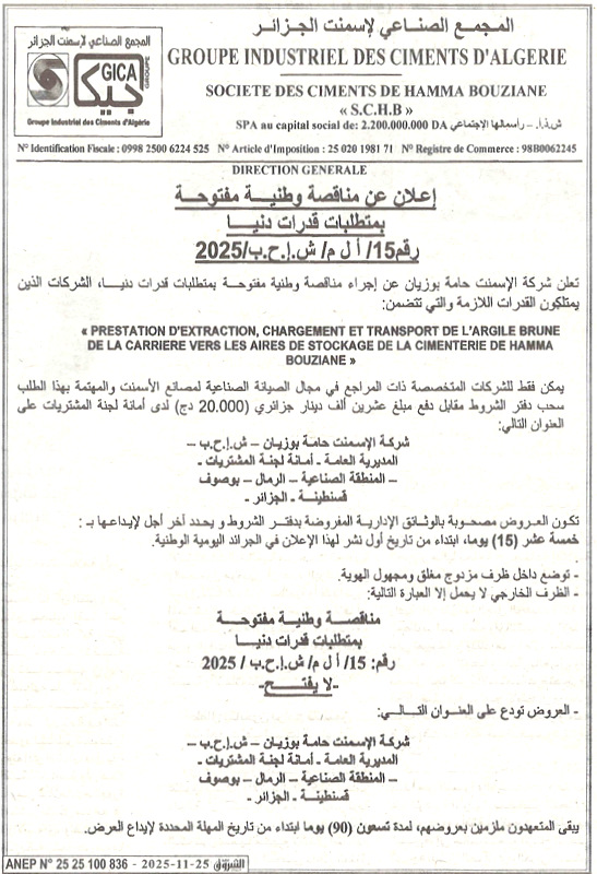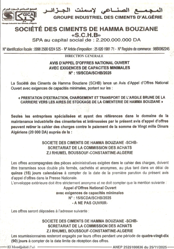 La société des ciments de Hamma Bouziane -SCHB-, lance un avis d’appel d’offres national ouvert avec exigences de capacité minimales, portant sur :