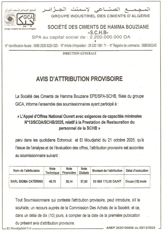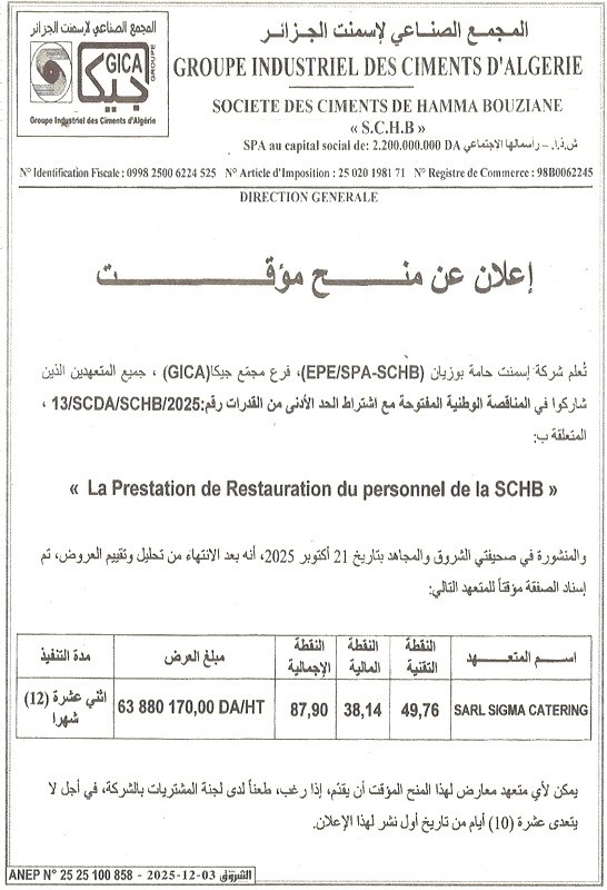 La société des Ciments de Hamma Bouziane EPE/SPA-SCHB, filiale du groupe GICA, informe l’ensemble des soumissionnaires ayant participé à l’appel d’offres national ouvert avec exigences de capacités minimales N° 13/SCDA/SCHB/2025 relatif à la prestation de restauration du personnel de la SCHB