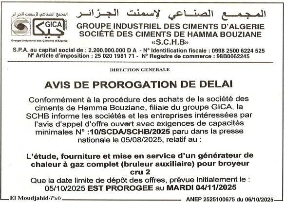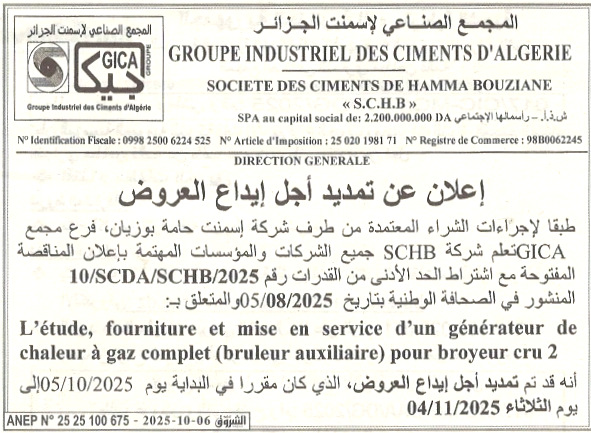 Conformément à la procédure des achats de la société des ciments de Hamma Bouziane, filiale du groupe GICA, la SCHB informe les sociétés et les entreprises intéressées par l’avis d’appel d’offre pivert avec exigences de capacités minimales N° 10/SCDA/SCHB/2025 paru dans la presse nationale le 05/08/2025, relatif au :