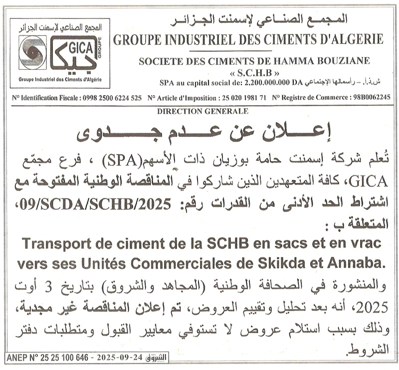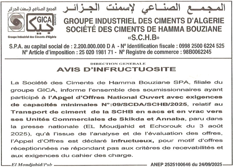 La société des Ciments de Hamma Bouziane SPA, filiale du groupe GICA, informe l’ensemble des soumissionnaires ayant participé à l’appel d’offres National ouvert avec exigences d capacités minimales N°09/SCDA/SCHB/2025, relatif au Transport de ciment de la SCHB en sacs et en vrac vers ses unités commerciales de Skikda et Annaba, paru dans la presse nationale (ELMOUDJAHID et EHOUROUK du 3 Aout 2025), qu’à l’issue de l’analyse et de l’évaluation des offres, l’appel d’offres est déclaré infructueux, pour motif d’offres réceptionnés ne répondant pas aux critères de recevabilité et aux exigences du cahier des charges.